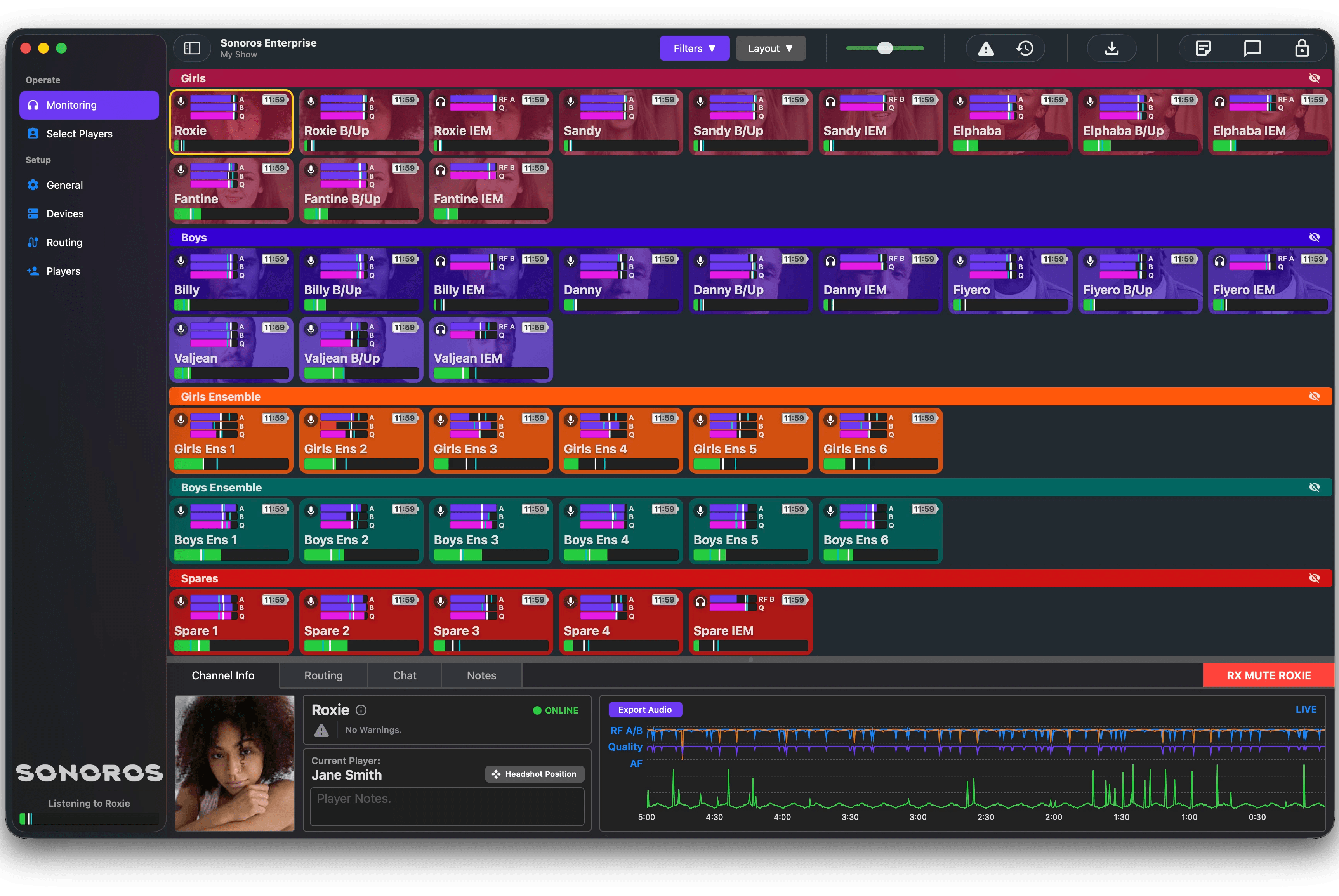 Manage complex shows with multiple players per role, with Sonoros players support. Easily switch between player profiles, and store headshots, notes and mic assignments per player.