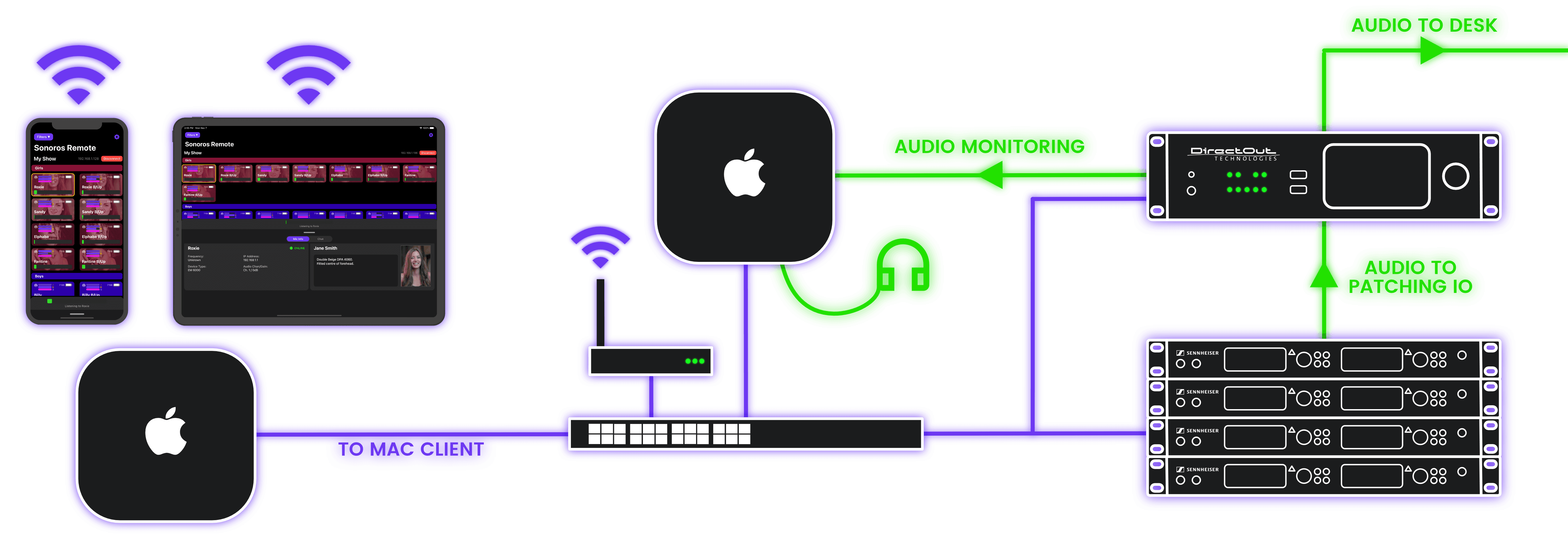 Connect unlimited iOS or Mac clients to an existing Sonoros session, and gain visibility of all information and audio as if you were backstage. Control externally with OSC commands.