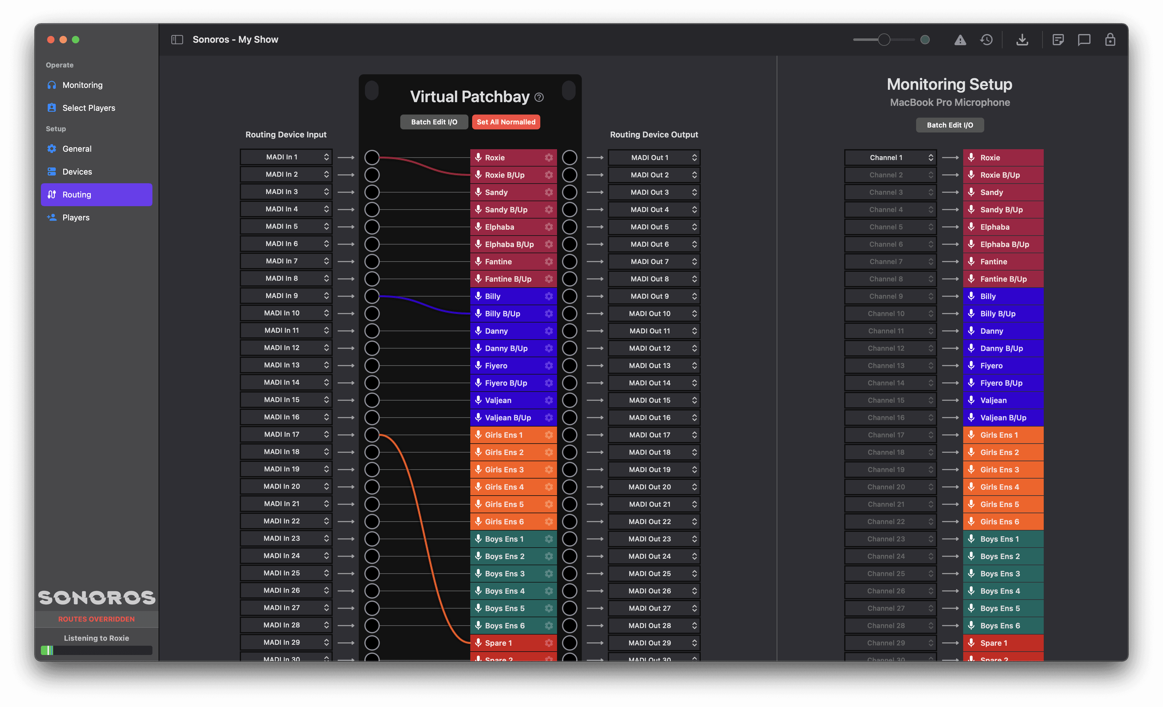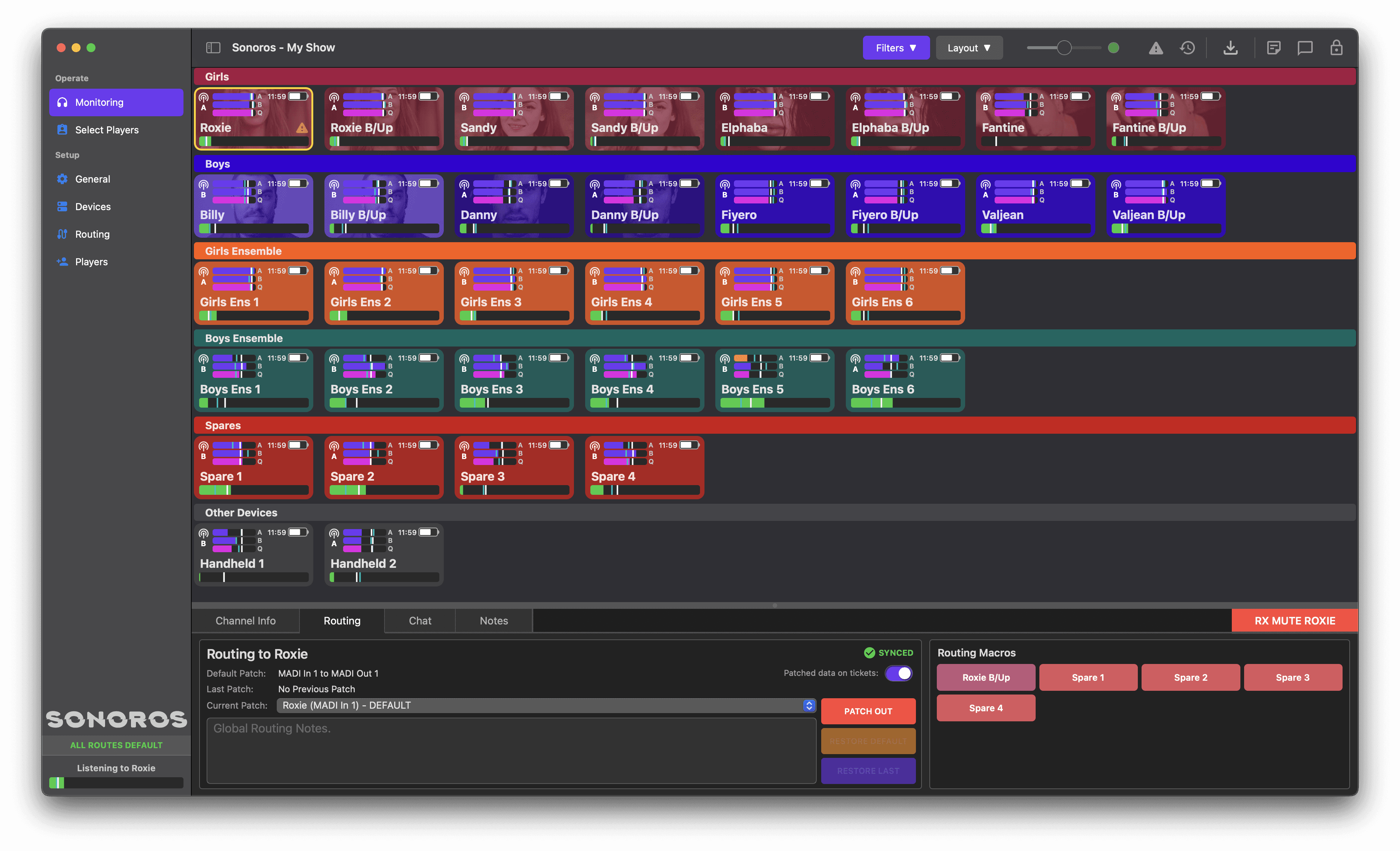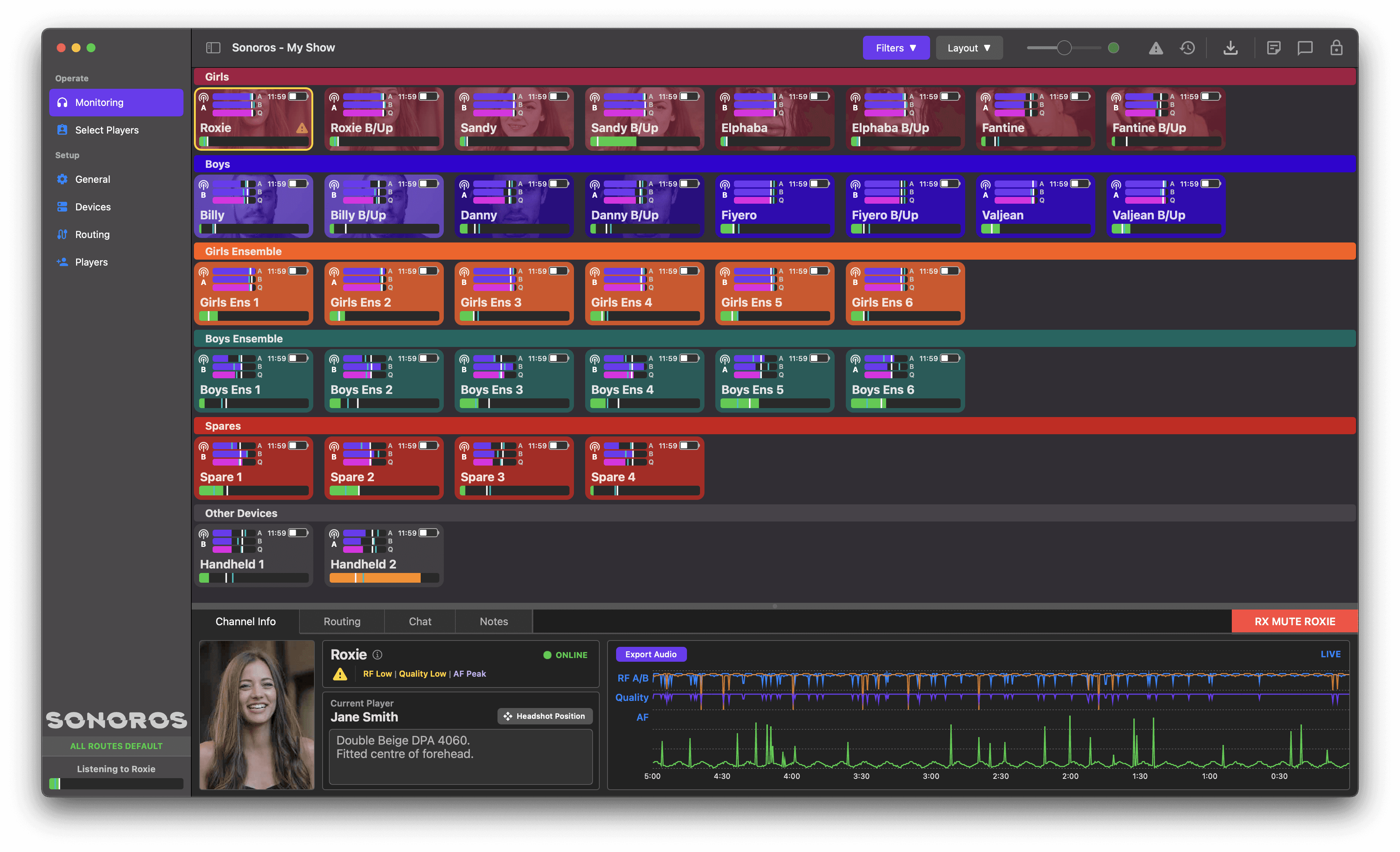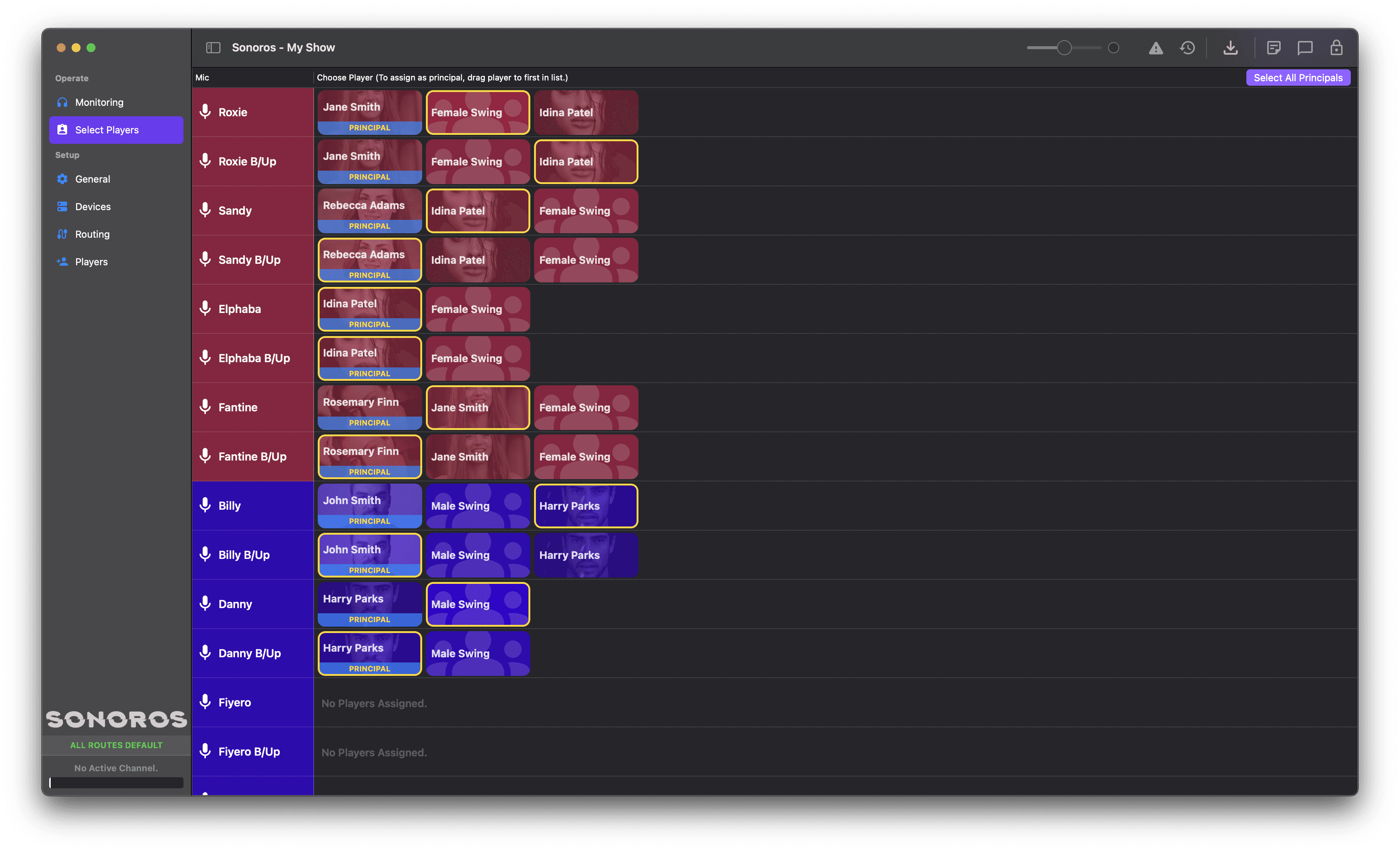 Manage complex shows with multiple players per role, with Sonoros players support. Easily switch between player profiles, and store headshots, notes and mic assignments per player.